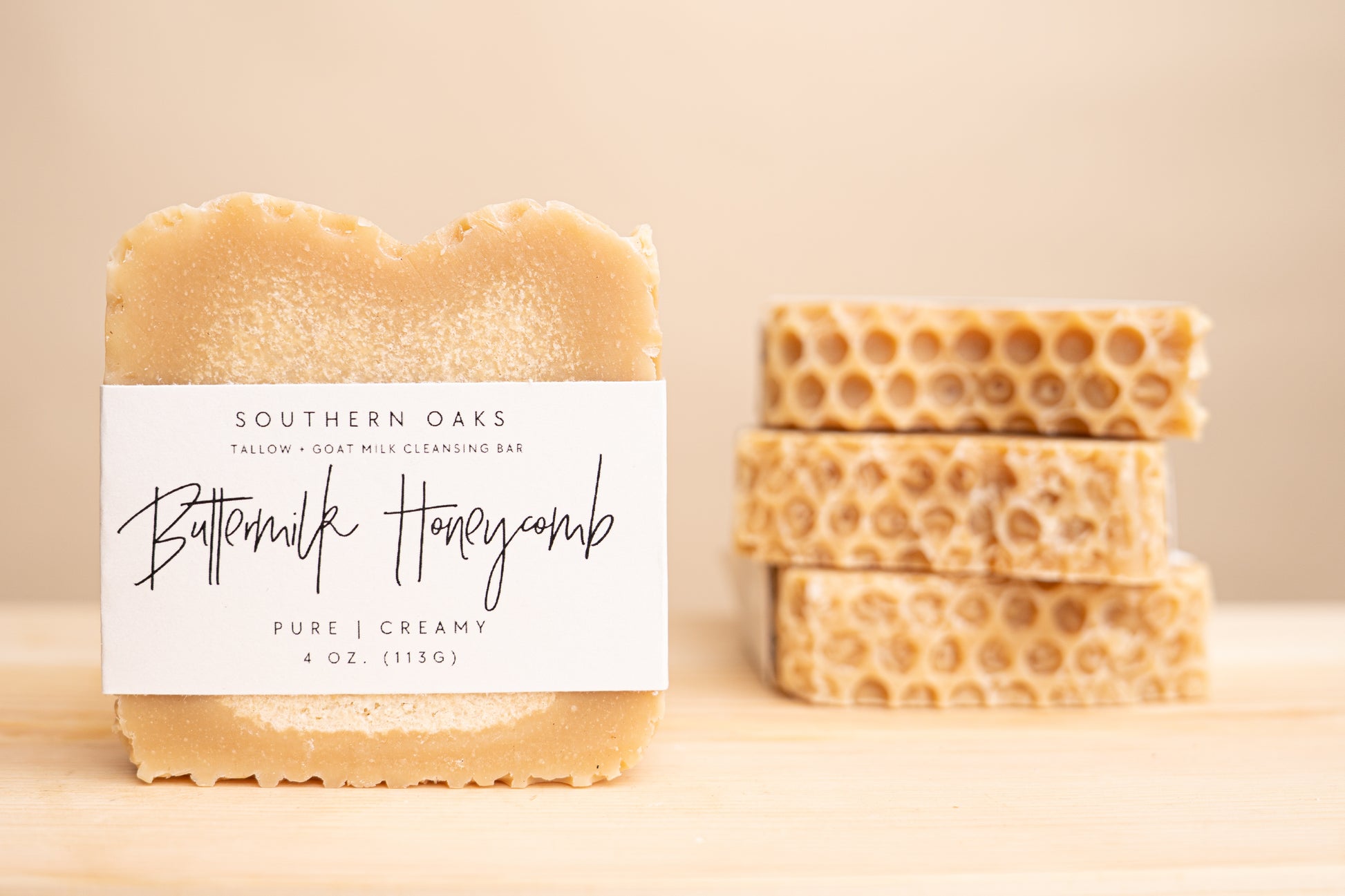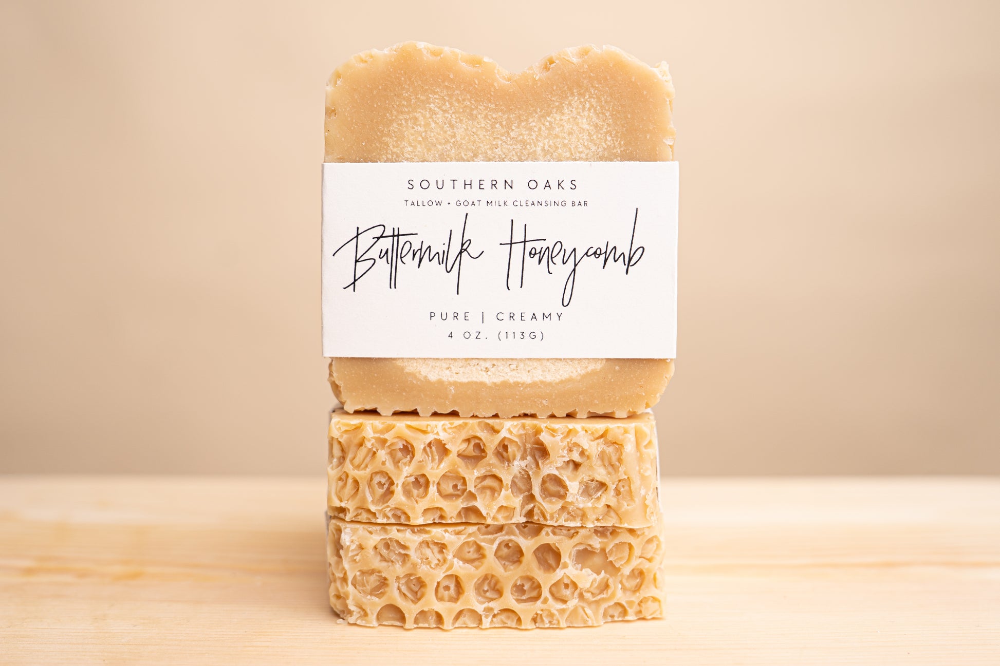 Indulge in the natural richness of farm-fresh goat milk and South Carolina–raised tallow with our Buttermilk Honeycomb Cleansing Bar. Each bar is handcrafted in small batches to create a creamy, nourishing lather that gently cleanses while restoring moisture to your skin.