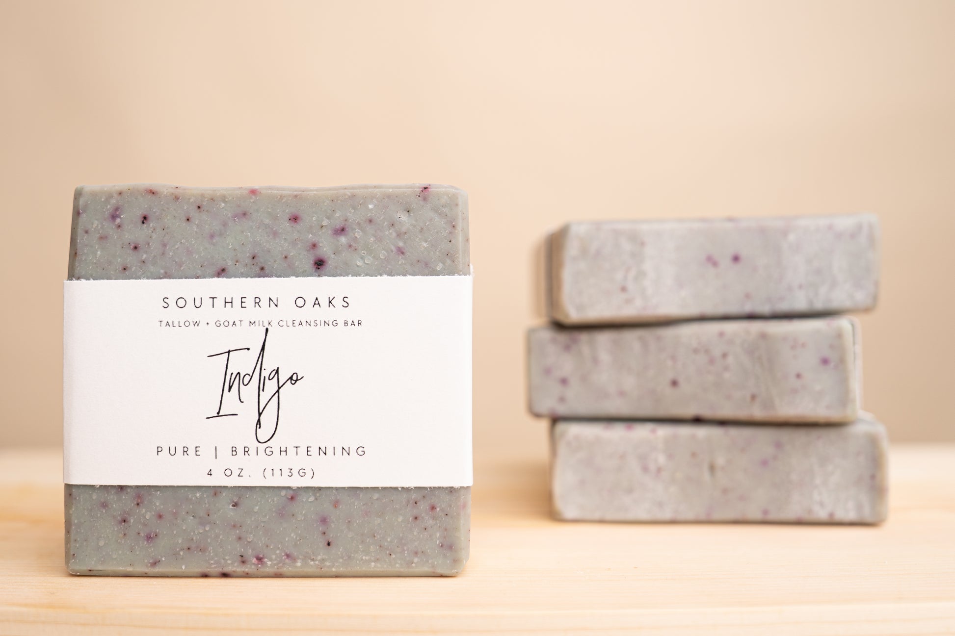 Gently cleanse and brighten your skin with our Indigo Infused Soap Bar. Made with pasture-raised tallow, raw goat milk, and naturally dried indigo, this bar exfoliates impurities and dead skin cells while delivering antioxidant-rich care. Indigo helps protect skin from environmental stressors and promotes a naturally radiant, refreshed complexion.